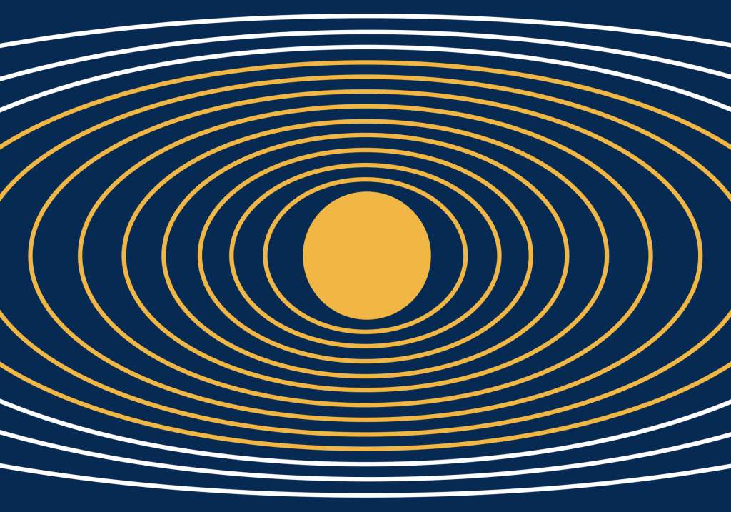 Nueve órbitas amarillas simbolizan los nueve planetas de nuestro sistema solar.