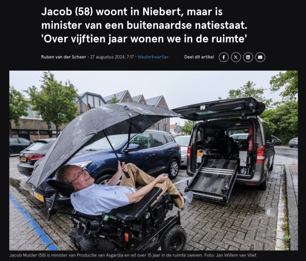 «Dentro de 15 años, viviremos en el espacio», dice el titular de una reciente entrevista con Jacob Mulder, ministro de Manufactura de Asgardia. «Vivir en el espacio es el sueño de cualquier fanático de la ciencia ficción. «No, no lo es», discrepa Jacob Mulder, un residente de Nibert y ministro asgardiano cuya misión es asegurarse de que la humanidad emigre al espacio», se lee en la columna del periódico Dagblad van het Noorden.