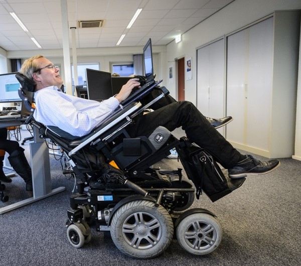 «Cuando tenía once años, mi cuerpo terminó creciendo demasiado rápido. El resultado es una curvatura en mi columna vertebral de unos 45 grados. En ese momento, las opciones eran sujetarlo con una varilla de metal o subirse a una silla de ruedas. Me negué a aceptar ninguna de las dos, así que busqué una tercera solución. Descubrí que se acababa de inventar un nuevo tipo de corsé ortopédico. Eso ayudó y mi situación mejoró, pero a medida que pasaban los años, mi espalda empeoró y, en 2014, tuve una segunda hernia de disco espinal. Estaba arreglado, pero después de eso, ya no podía caminar correctamente. Después de dos minutos de caminar, ya no puedo usar mi pierna izquierda, porque los nervios que conducen a ella se aprietan en mi columna vertebral. Tengo el mismo problema cuando me siento derecho. Así que ahora, estoy en una silla de ruedas muy avanzada, inclinado hacia atrás, casi acostado, pero el asiento está curvado de tal manera que todavía puedo mirar hacia adelante. También conduzco mi propio coche al estilo ‘Star Trek’ y esa combinación me permite seguir trabajando».