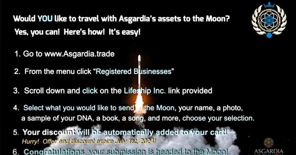 ¿Te gustaría enviar algo a la luna con Asgardia? ¡Puedes, y es fácil! Tenemos un regalo especial para todos los que están viendo este video. Sigan las instrucciones que se muestran en esta pantalla para enviar algo a la luna en la misma cápsula del tiempo antes del 1 de julio, y pueden recibir un 10 % de descuento en el envío de algo significativo para vivir en un legado histórico en la luna potencialmente durante años. Por favor, tomen una captura de pantalla de esta imagen para su uso ahora.