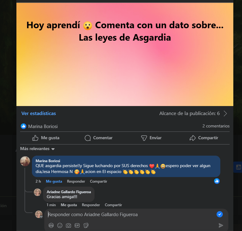 Cheryl: Sí, así que el trabajo continúa, LIfeShip sigue su trabajo y Copernic Space continúa su trabajo. Todavía tengo, tenemos, ambos ocupan posiciones en nuestra plataforma de negocios en desarrollo en la que los Asgardianos también pueden acceder a esos recursos. Ambas entidades y SpaceBorn United están lanzando nuevas iniciativas, que pronto lanzarán su equipo físico de FIV en órbita baja terrestre en unos meses. Aún no tienen una fecha específica, pero ya tienen su nave, la firmaron y los materiales ya se entregaron. Están listos para partir lo antes posible, lo que también será otro momento histórico, y pronto recibiremos más información. Debería ser quizás en 2026. Cuando se produzca otro alunizaje, este será un alunizaje conmovedor. Irá en un rover, así que estará vivo. Se moverá por la superficie lunar, no solo se quedará allí. Esto también me permite imaginar más recursos de Asgardia yendo allí, junto con más trabajo colaborativo de otros Asgardianos. Todas estas oportunidades existen para que la gente las explore, así que espero que todos los Asgardianos que podamos estén interesados y puedan participar e ir a la Luna.