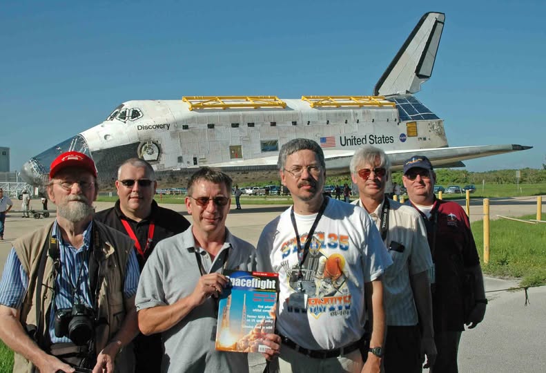He aquí el llamado a foto para el equipo de vuelo espacial BIS en KSC hoy durante el traslado del transbordador espacial Discovery desactivado.