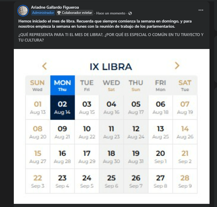 Hemos iniciado el mes de libra. Recuerda que siempre comienza la semana en domingo, y para nosotros empieza la semana en lunes con la reunión de trabajo de los parlamentarios.