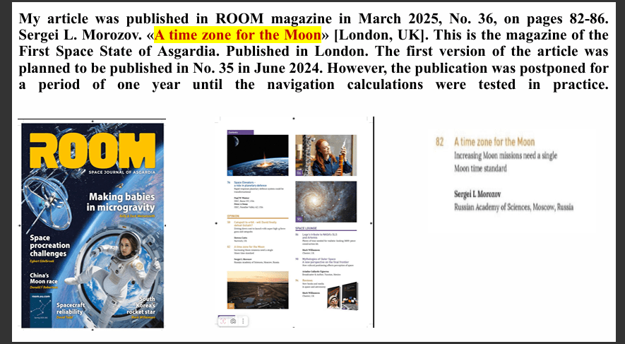 La capital del mundo; Sistema de Transporte Espacial de Referencia Unificado [URSS TS]; Calendario Espacial de Referencia Unificado [URSSC]; formato del tiempo lunar lineal absoluto; línea de bolsillo, línea de trayectoria lunar, “esfera Morozov”; ascensores espaciales síncronos de la Luna con plataformas en los puntos de libración L1 y L2; puertos de lanzamiento y salida de naves espaciales, pasajeros y carga desde los puntos de libración L1 y L2; satélites de transporte-metro [satélites MS].