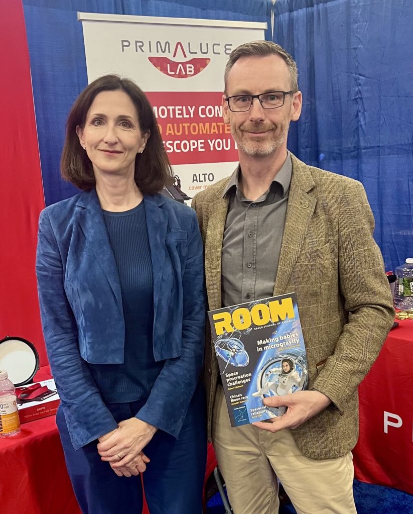 Steve Kelly, director de diseño de la revista Room Space Journal, ya está en el evento; le vemos aquí con la profesora experta en estudio de exoplanetas, Sara Seager de la Universidad de Cambridge, Massachusetts, Estados Unidos.